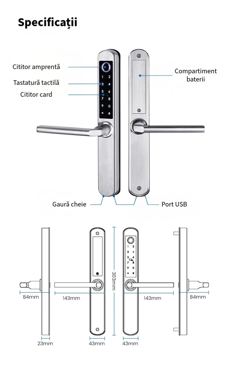 Design Robust și Rezistent: Corp din aliaj de zinc de calitate superioară, rezistent la apă și uzură zilnică (IP65 waterproof). Finisaj elegant mat, compatibil cu uși glisante de grosime 35-95 mm. Dimensiuni compacte: 303 x 43 x 23 mm – se potrivește perfect fără modificări majore.