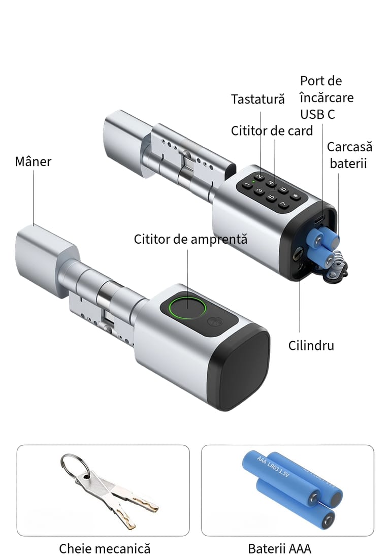 Moduri de deschidere: amprentă; parolă; card; cheie; control prin aplicație mobilă